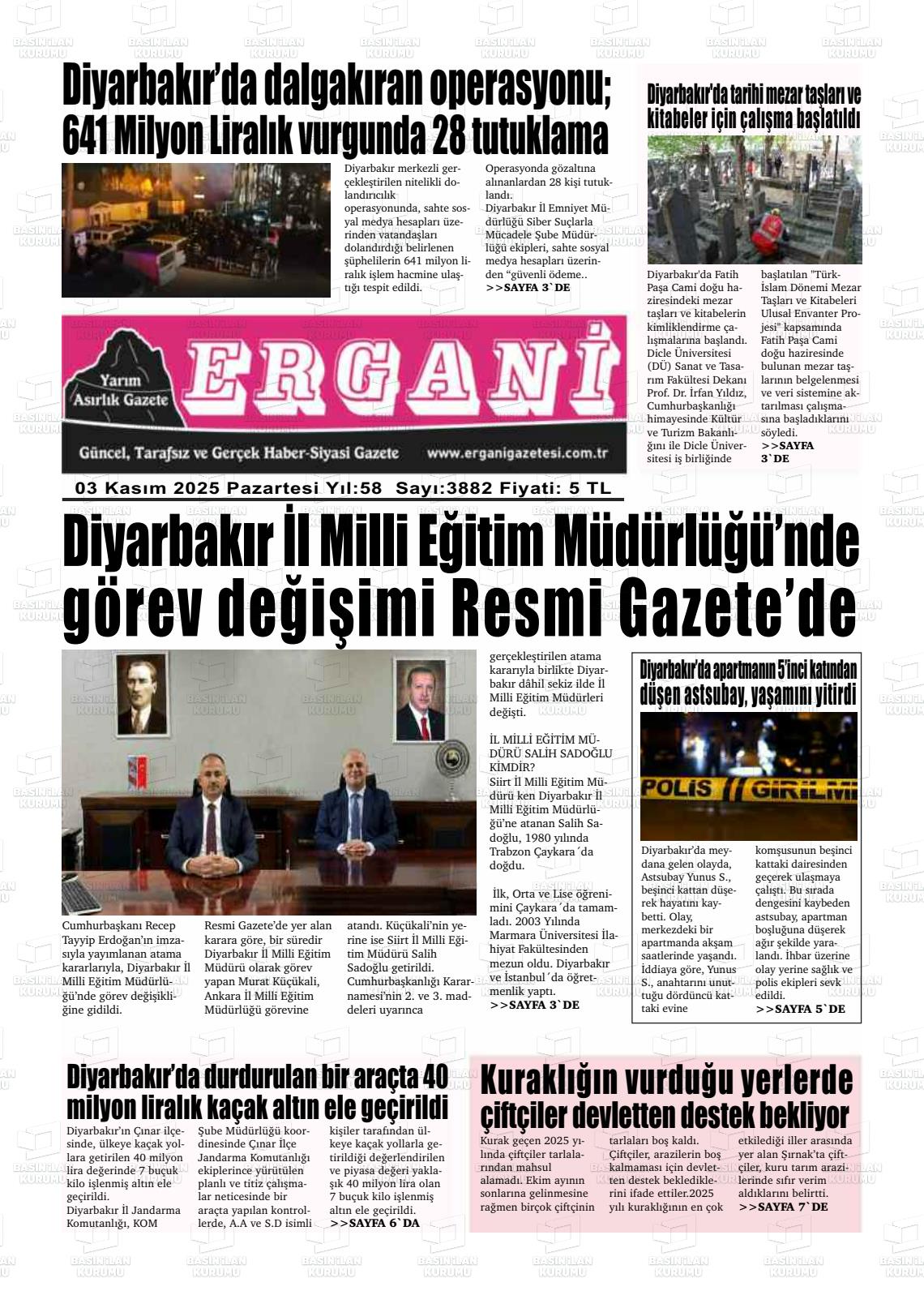 Dİyarbakır Yerel Gazeteleri 03 Kasım 2025, Pazartesi Günü Manşeti