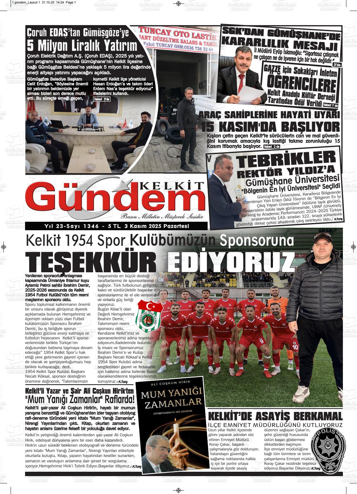 Gümüşhane Yerel Gazeteleri 03 Kasım 2025, Pazartesi Günü Manşeti