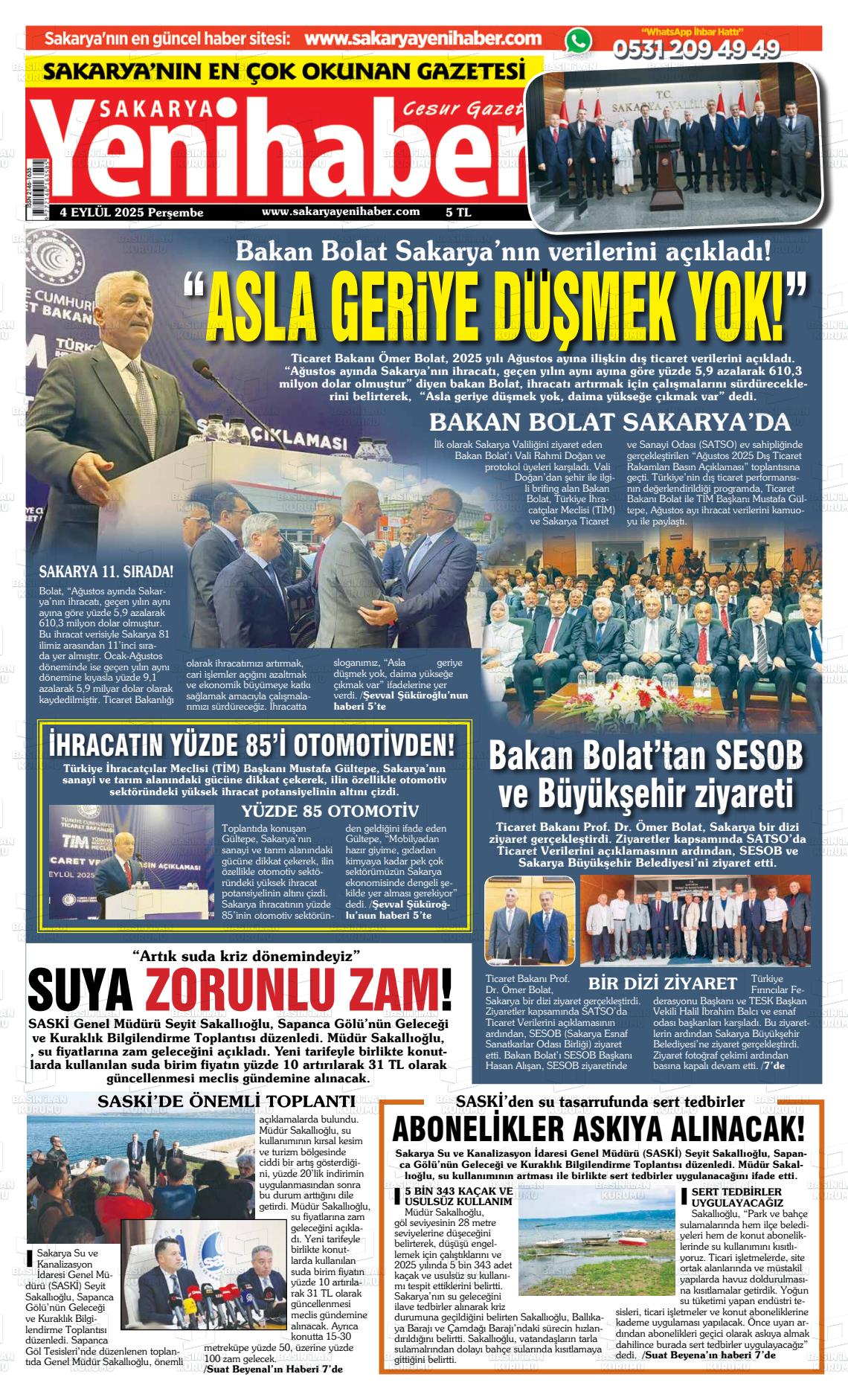 Sakarya Yerel Gazeteleri 03 Kasım 2025, Pazartesi Günü Manşeti